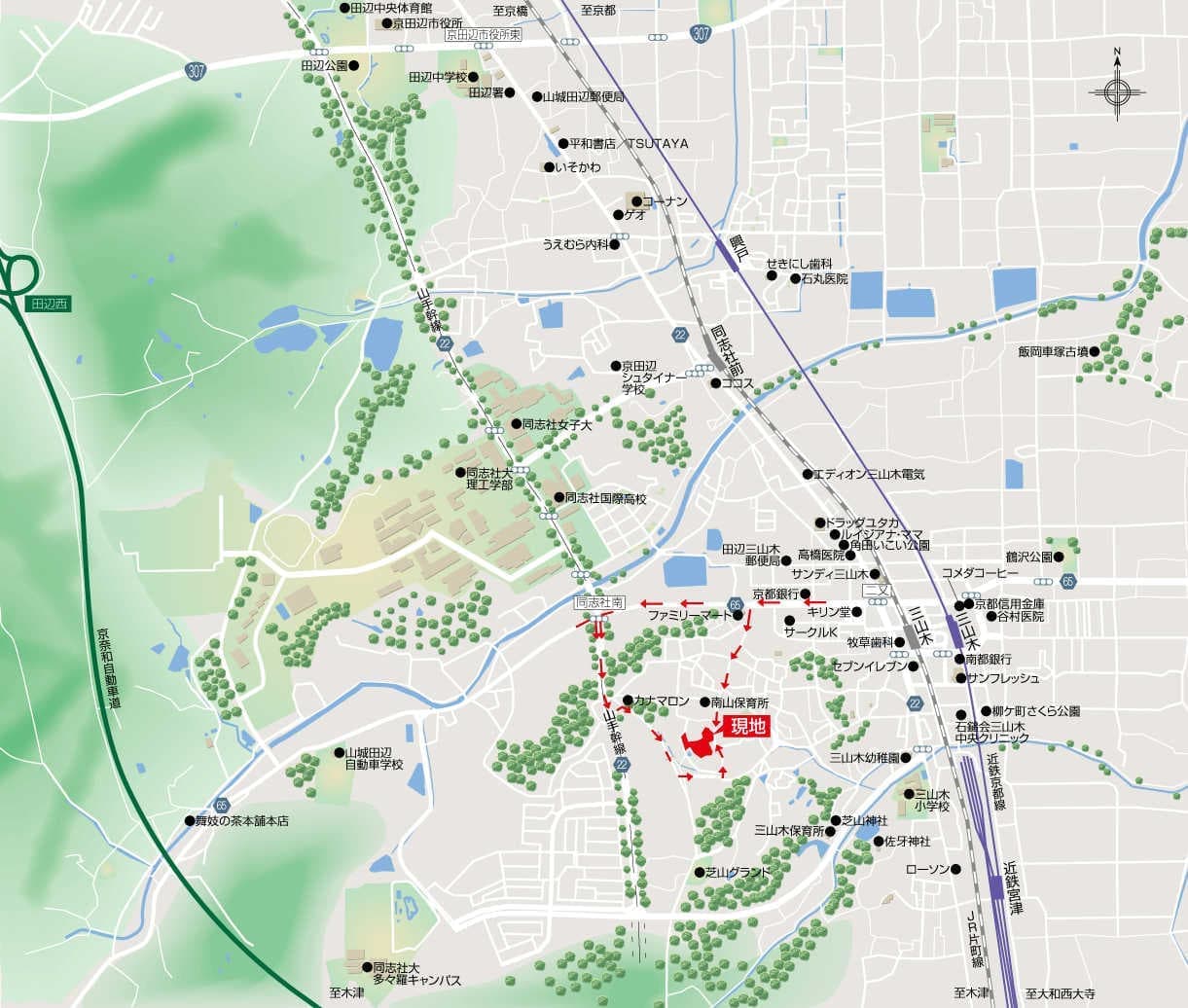 近隣にはシュタイナー学校や同志社国際中学校・高等学校、同志社大学・同志社女子大学と教育施設が集まっています。
